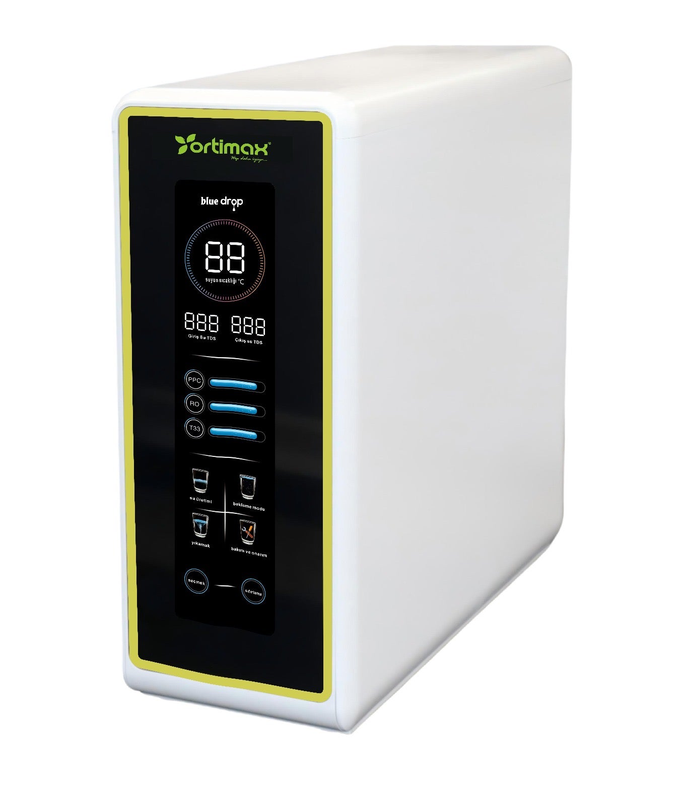 - Ters Ozmoz (RO) Sistemini kullanarak suyunu doğrudan besleme halinde arıtır. Bu teknoloji, suyun her litre damlasını hızlı bir şekilde arıtarak atık su miktarını en aza indirir .